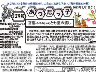 Since the first issue in 1985, we've issued Atsutakko twice a year, providing the news of events & researches regarding the histories & cultures of Atsuta.